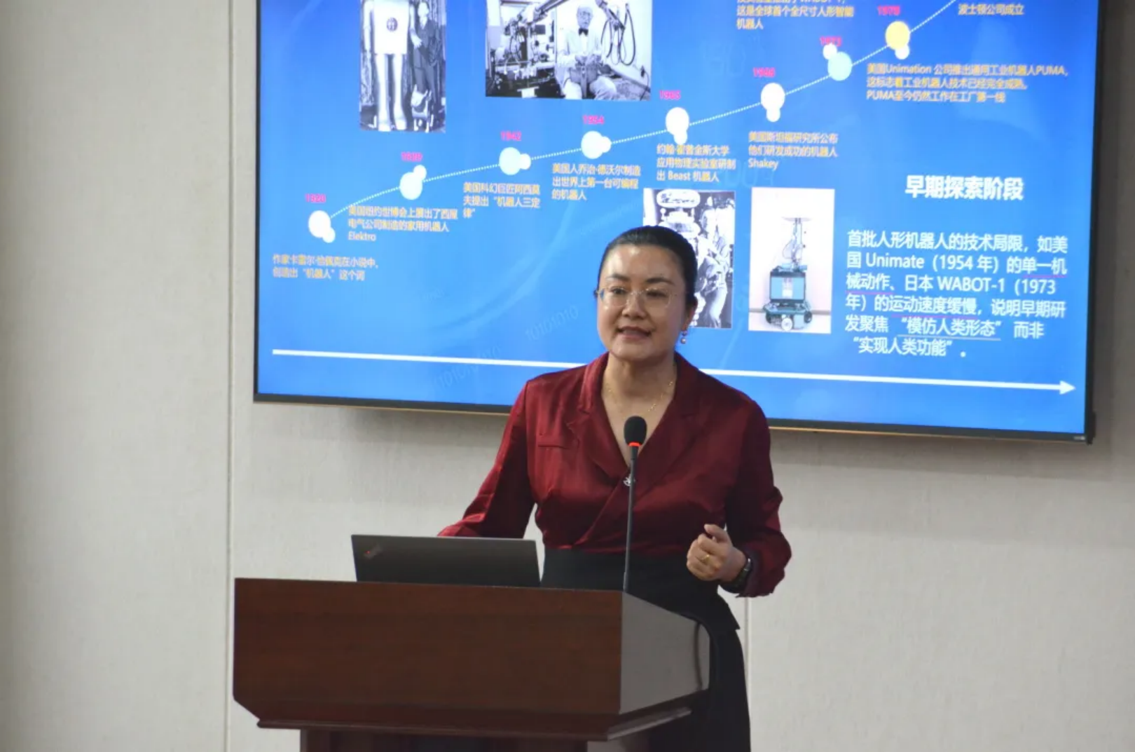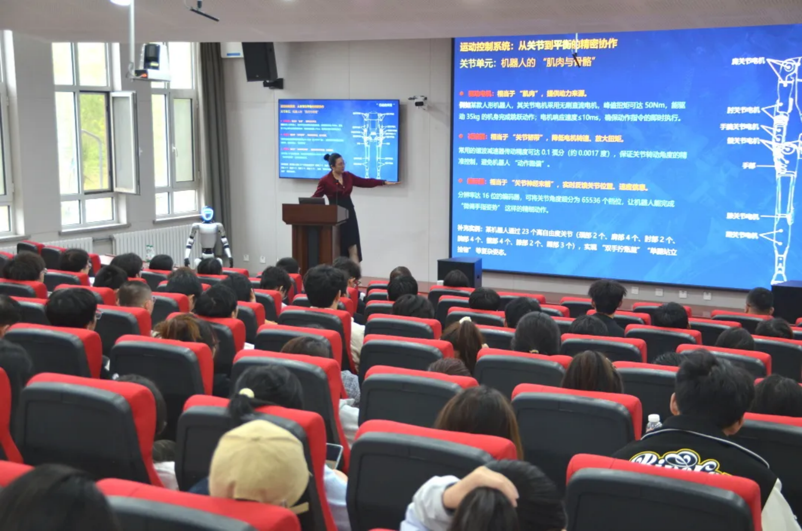 首先,石林老师以时间为脉络,从机器人概念的提出、早期机器人的展示以及如今机器人行业的飞速发展三个方面,为大家系统梳理了机器人行业的发展历程以及人形机器人的重要发展节点,并详细阐释了机器人三大定律的核心内涵,强调其在保障人机安全协作中的重要意义。随后,石林老师为大家重点介绍了当前人形机器人应用的三大技术系统,围绕运动控制、环境感知和智能决策展开讲解,同时她指出,多技术的整合与场景适配是当前机器人行业发展的主要挑战。为让抽象技术更易理解,石林老师通过精彩的案例视频,向大家直观展示了当前机器人在行走、跑步、跨越障碍等运动能力上取得的显著成就,同时介绍了人形机器人在高校科研项目、教学、竞赛中的具体应用。