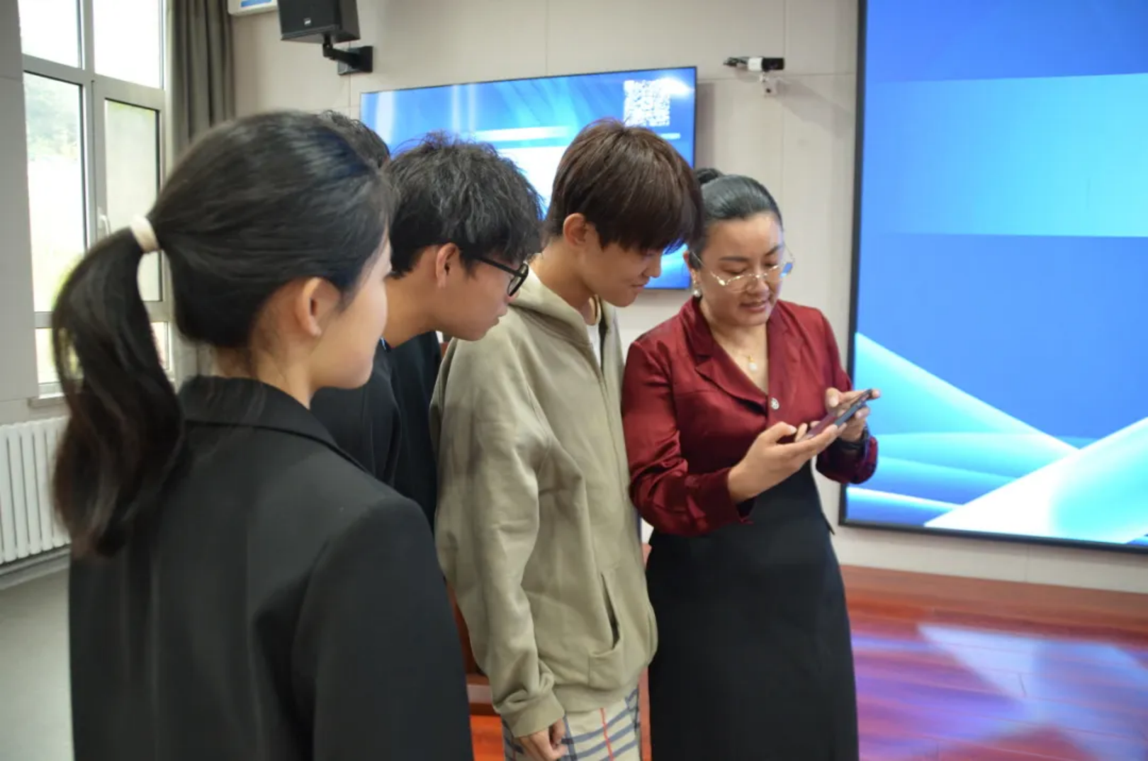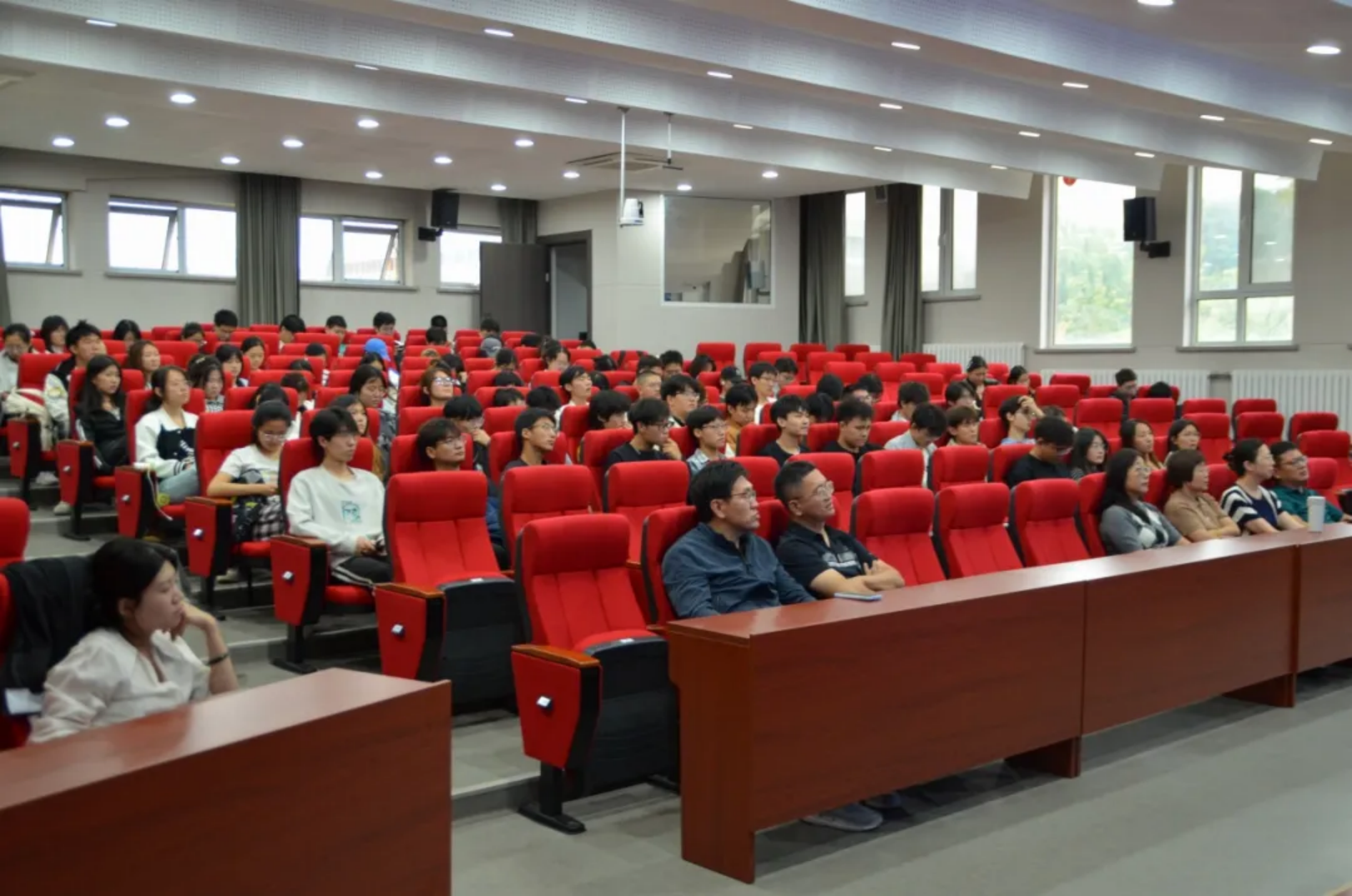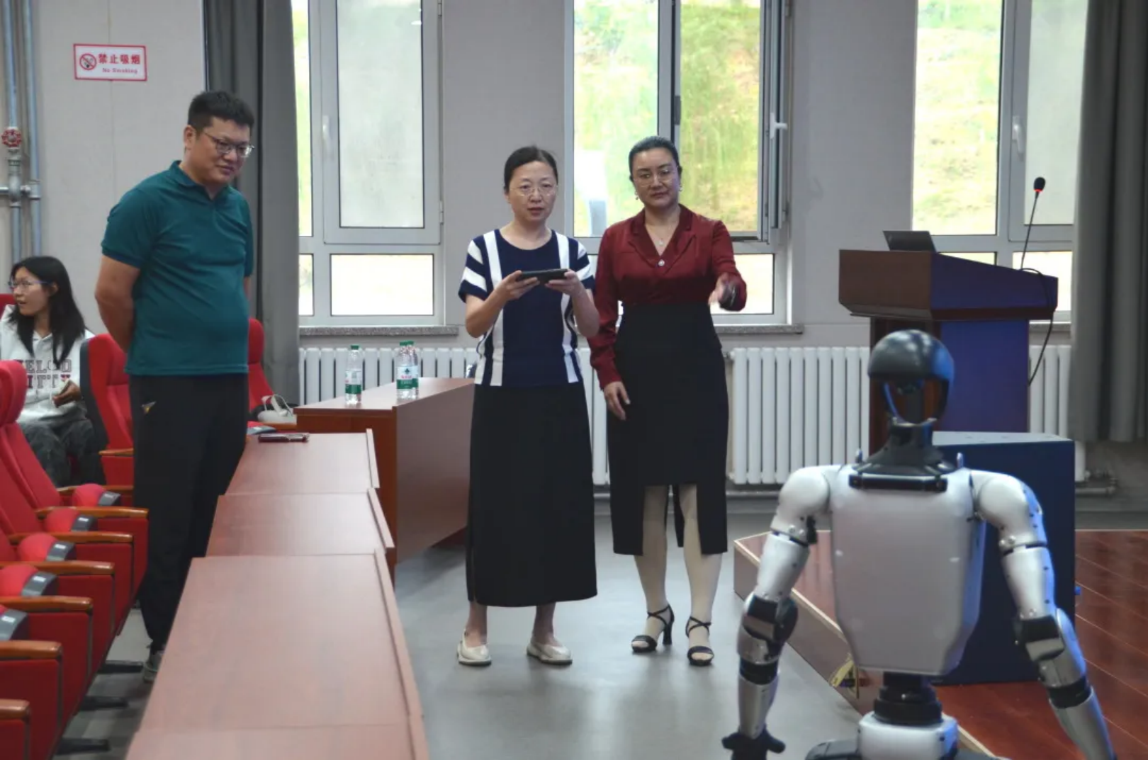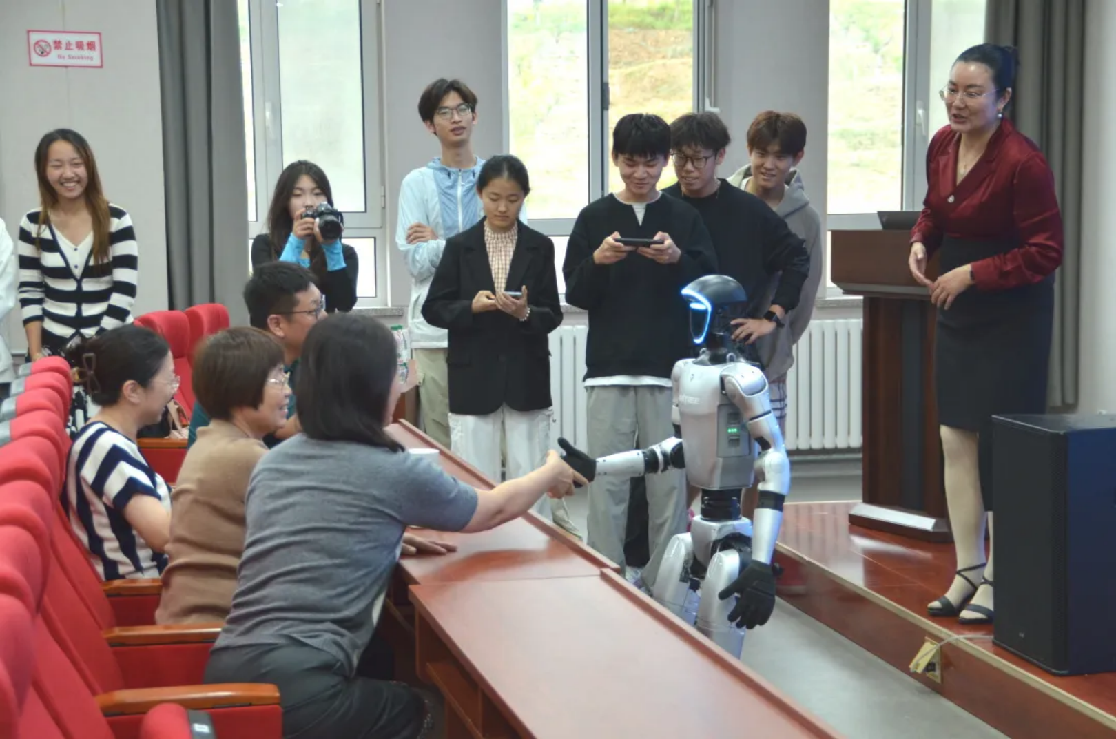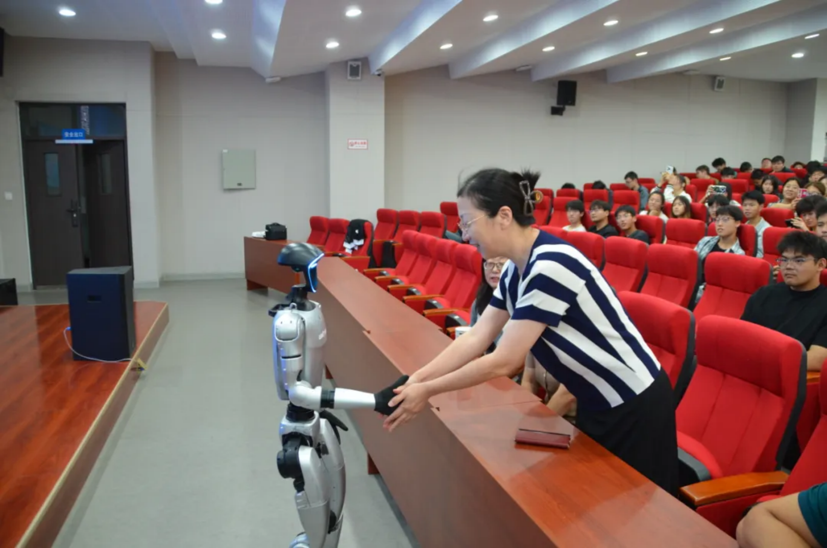 现场讲解结束后,讲座进入互动体验环节,讲台边摆放的G1人形机器人成为师生关注的焦点,在石林老师的耐心指导下,现场师生依次上前进行简单操作,通过控制器发送指令,机器人流畅完成握手、挥手、转身等简单协调的肢体动作。部分同学在石林老师的指导下尝试让机器人与在场老师进行简单的握手互动,现场气氛十分活跃,师生们还围绕人形机器人相关话题,与石林老师展开深入探讨。