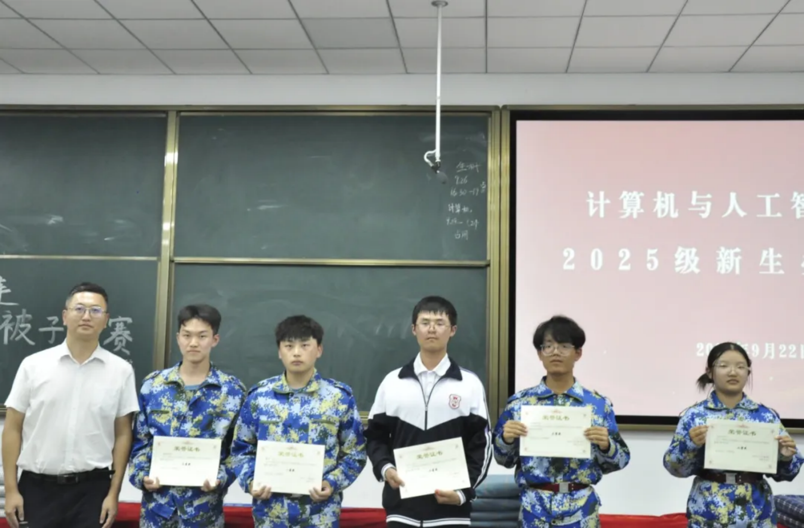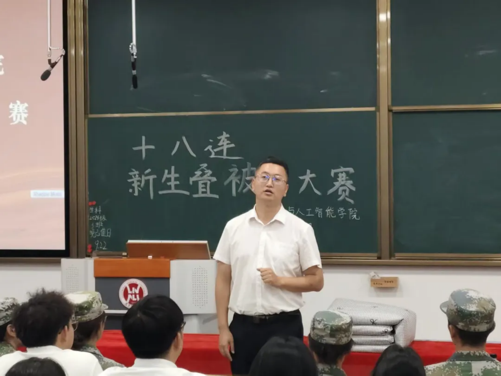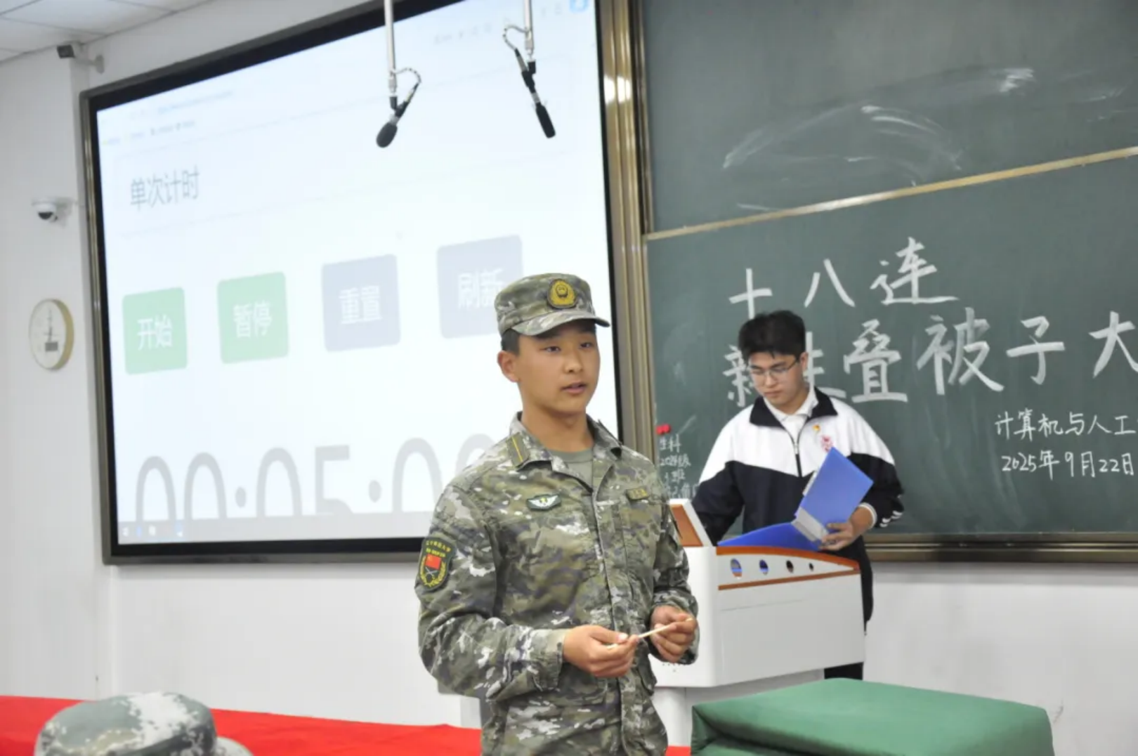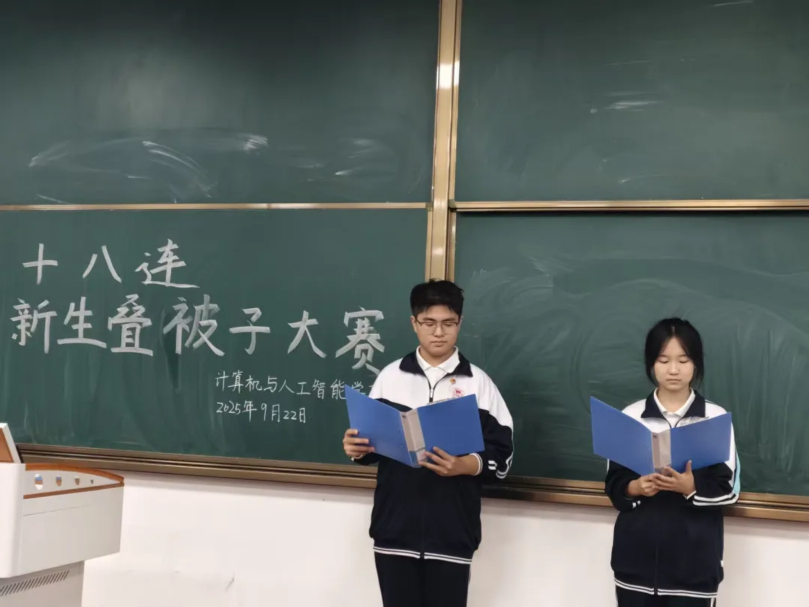 为切实提升我院学子修养内涵,引导同学们营造富有特色的寝室文化环境,同时集中展现新生集体昂扬向上的精神风貌与规范整洁的居住环境,计算机与人工智能学院于9月22日18时30分于一教105举办“被”显匠心,“叠”出风华——新生叠被子大赛。出席本次大赛的嘉宾有学院团委书记兼2025级辅导员于祥昀,军训十八连全体教官,团委学生会代表以及2025级全体本科生。本次大赛由罗文彤和张麒浩主持。