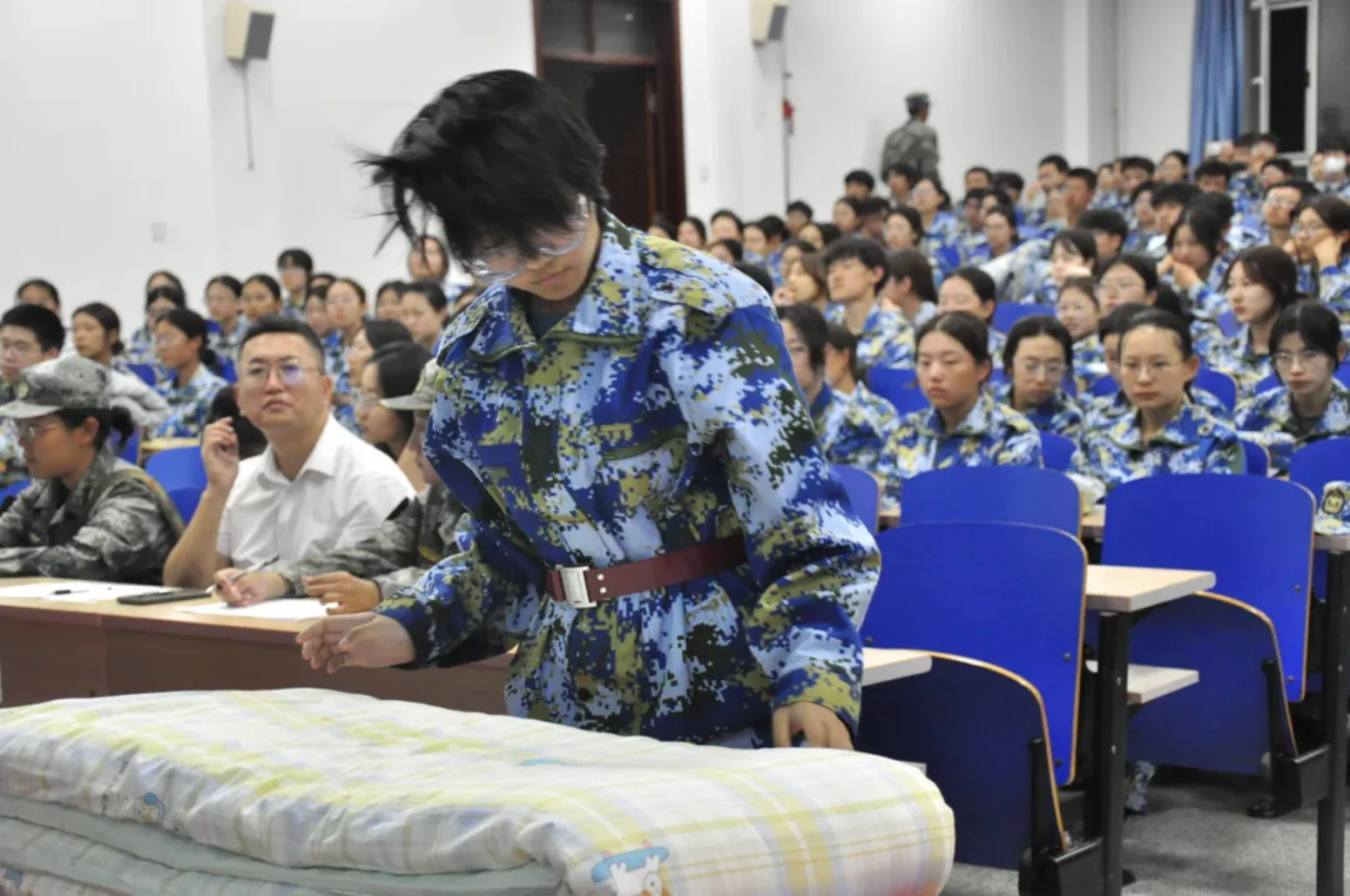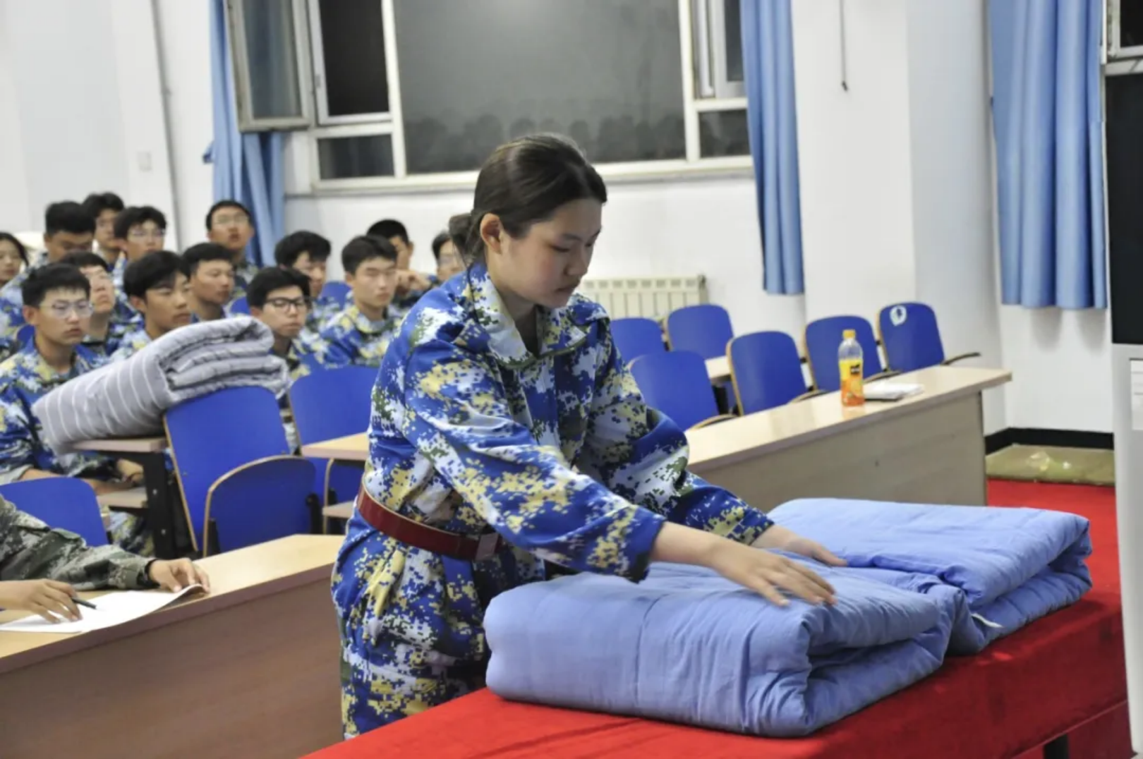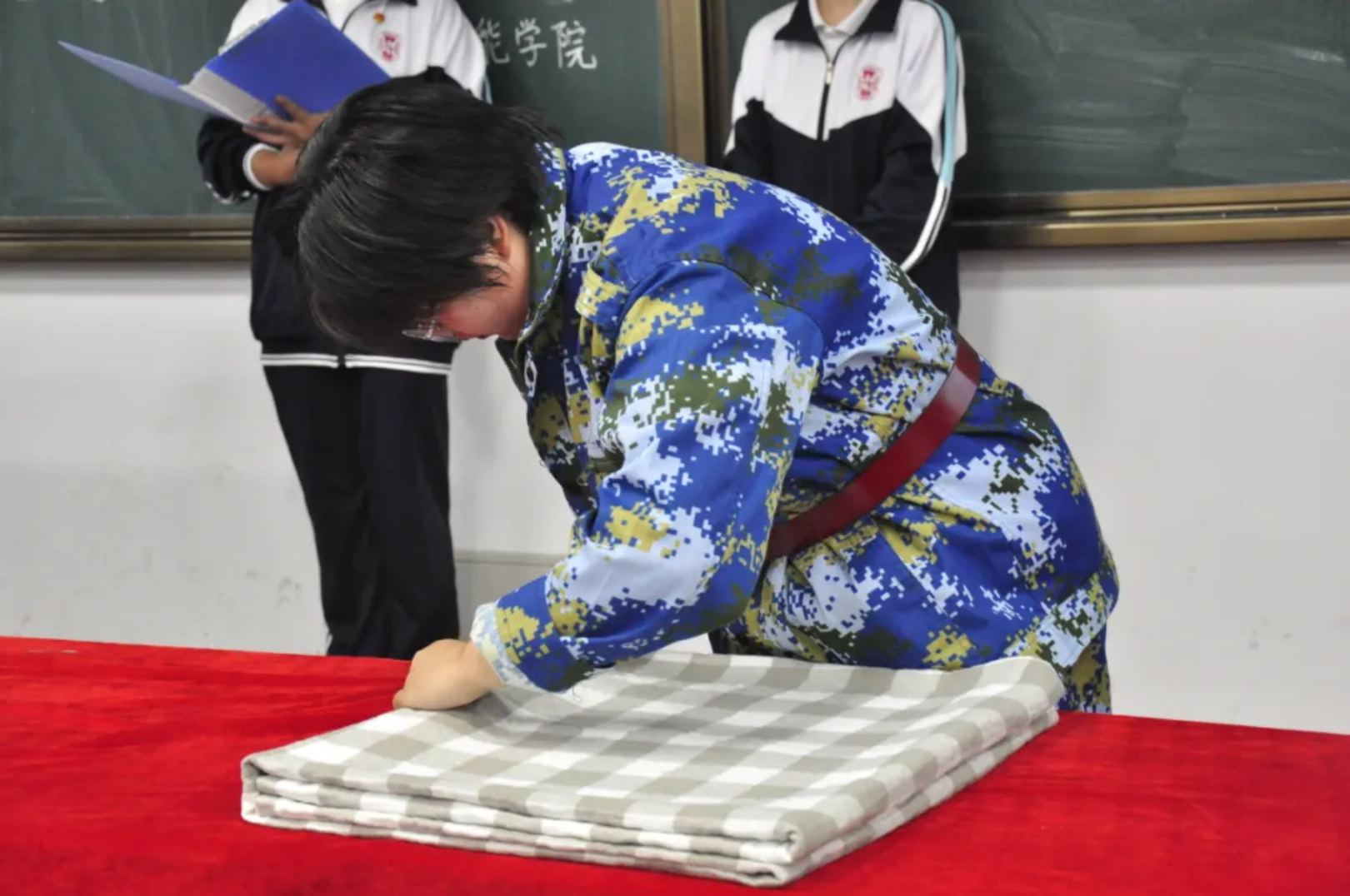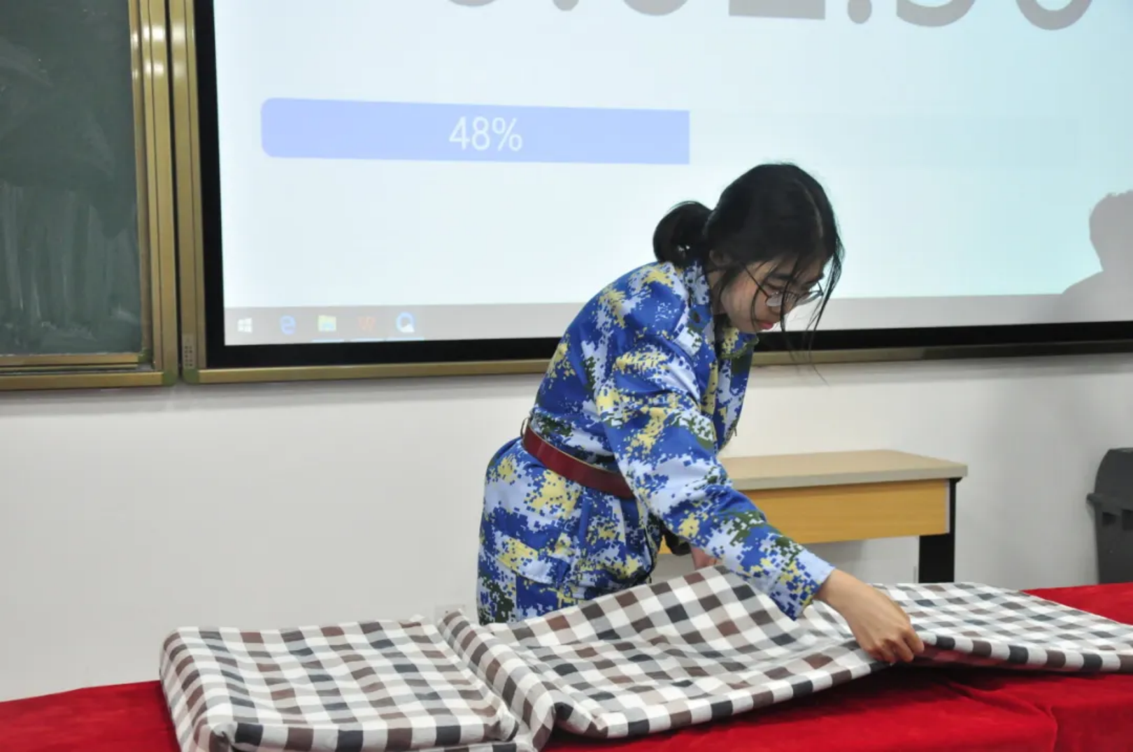 小组赛结束,刁柯诚教官向大家展示“豆腐块”的正确叠法,演示了“三分叠,七分修”的过程,同时为大家讲解了评分标准,同学们更加明确地认识到了如何叠出一个标准的“豆腐块”。