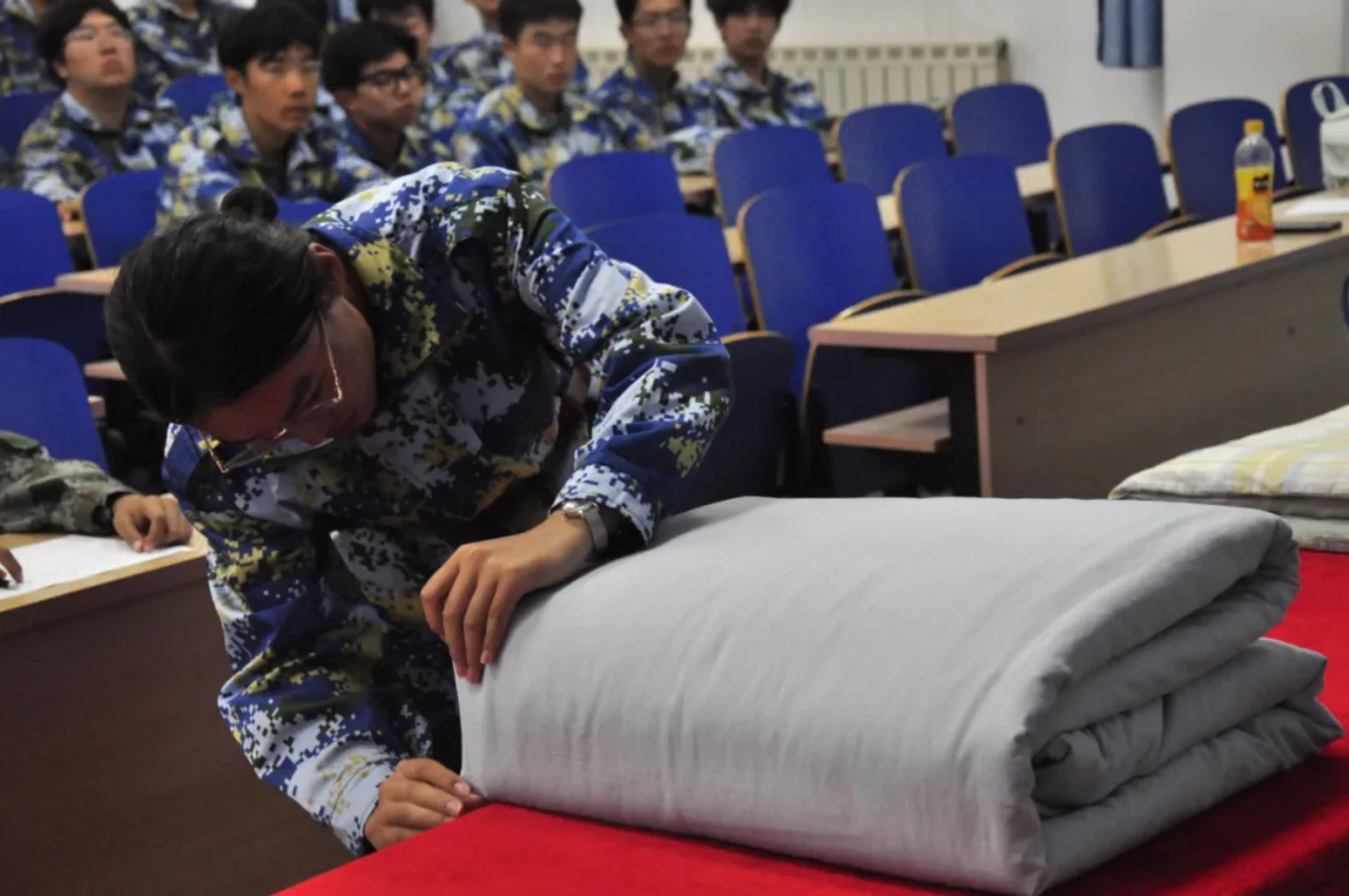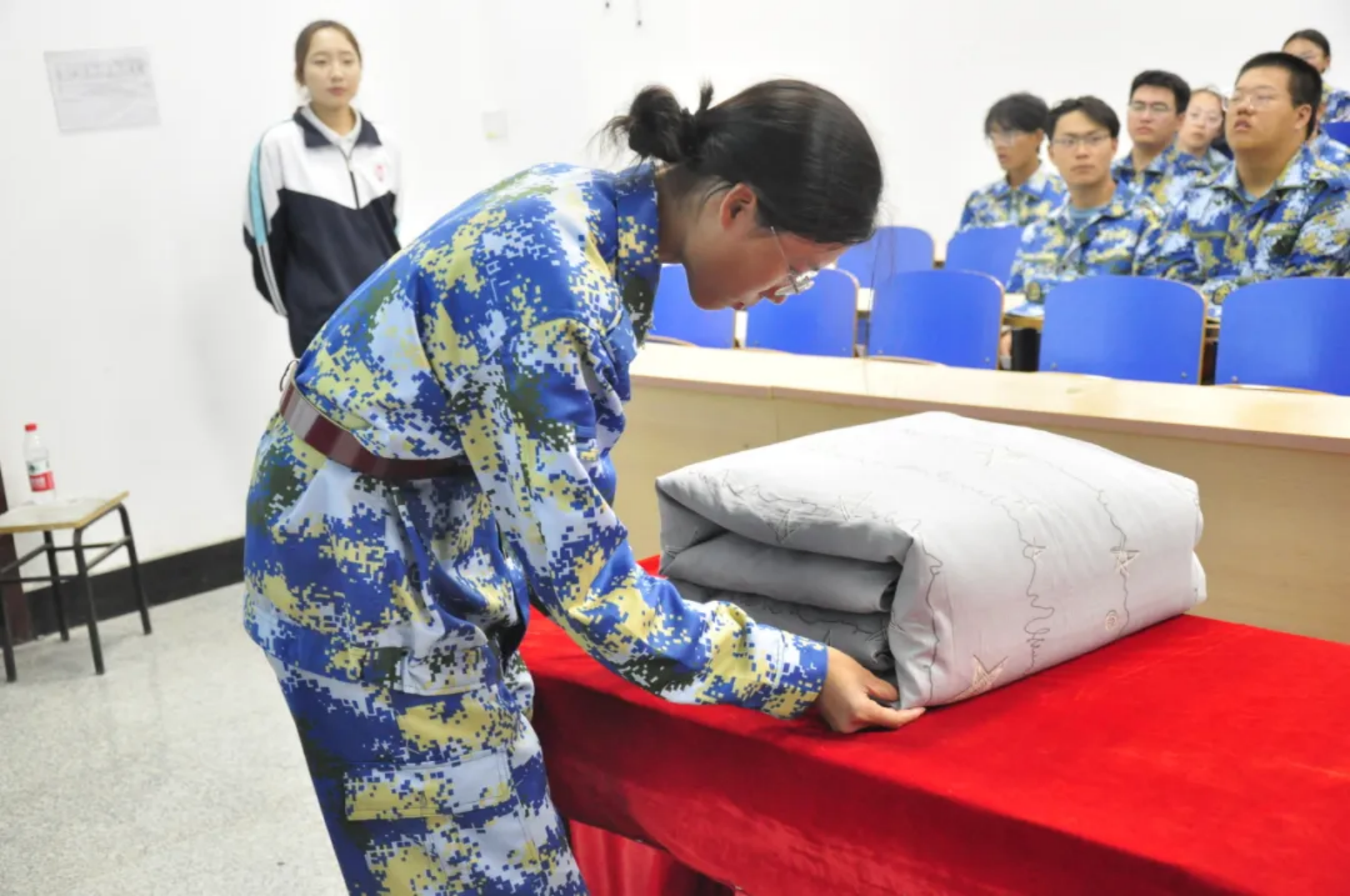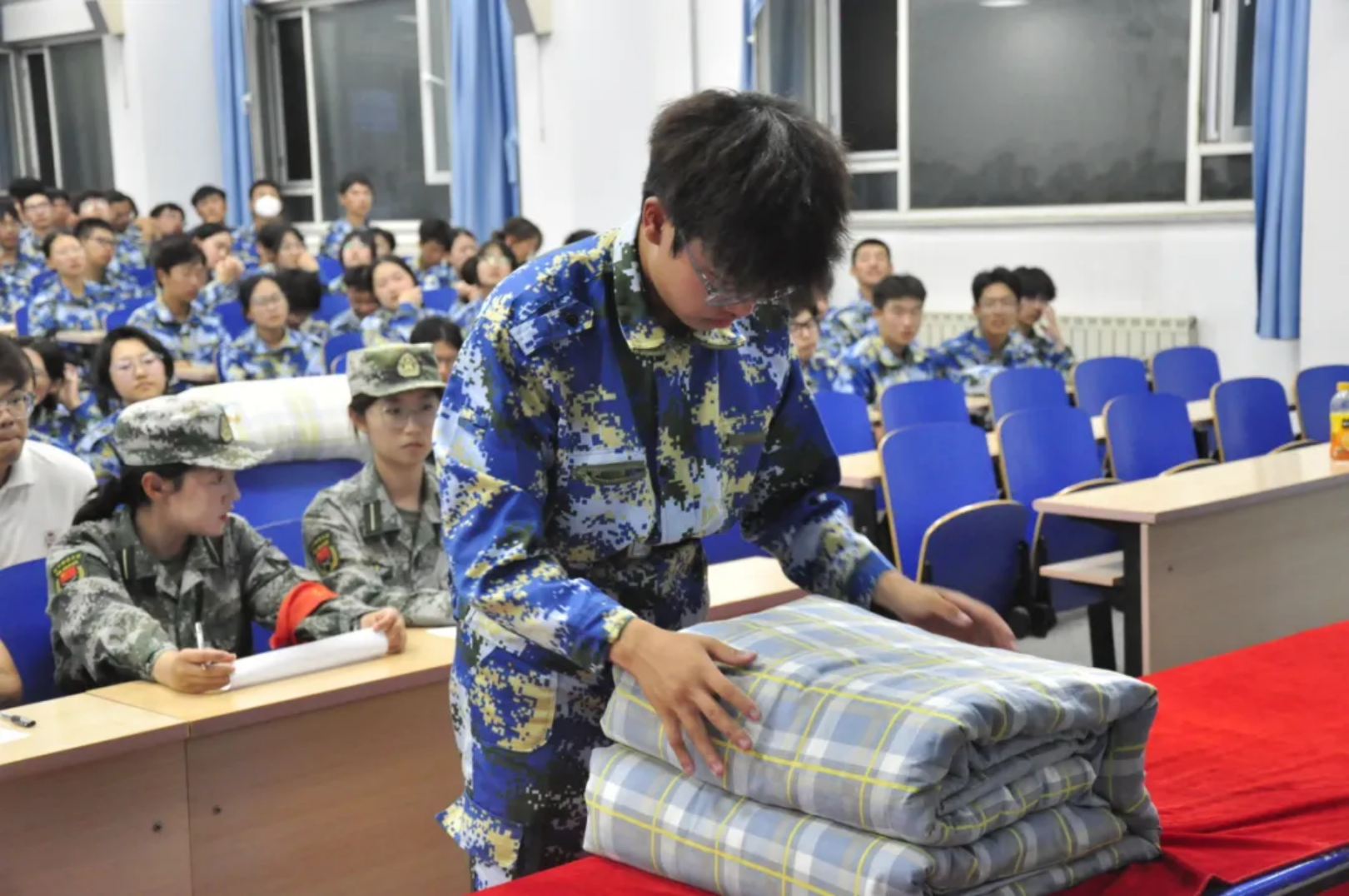 小组赛结束,刁柯诚教官向大家展示“豆腐块”的正确叠法,演示了“三分叠,七分修”的过程,同时为大家讲解了评分标准,同学们更加明确地认识到了如何叠出一个标准的“豆腐块”。