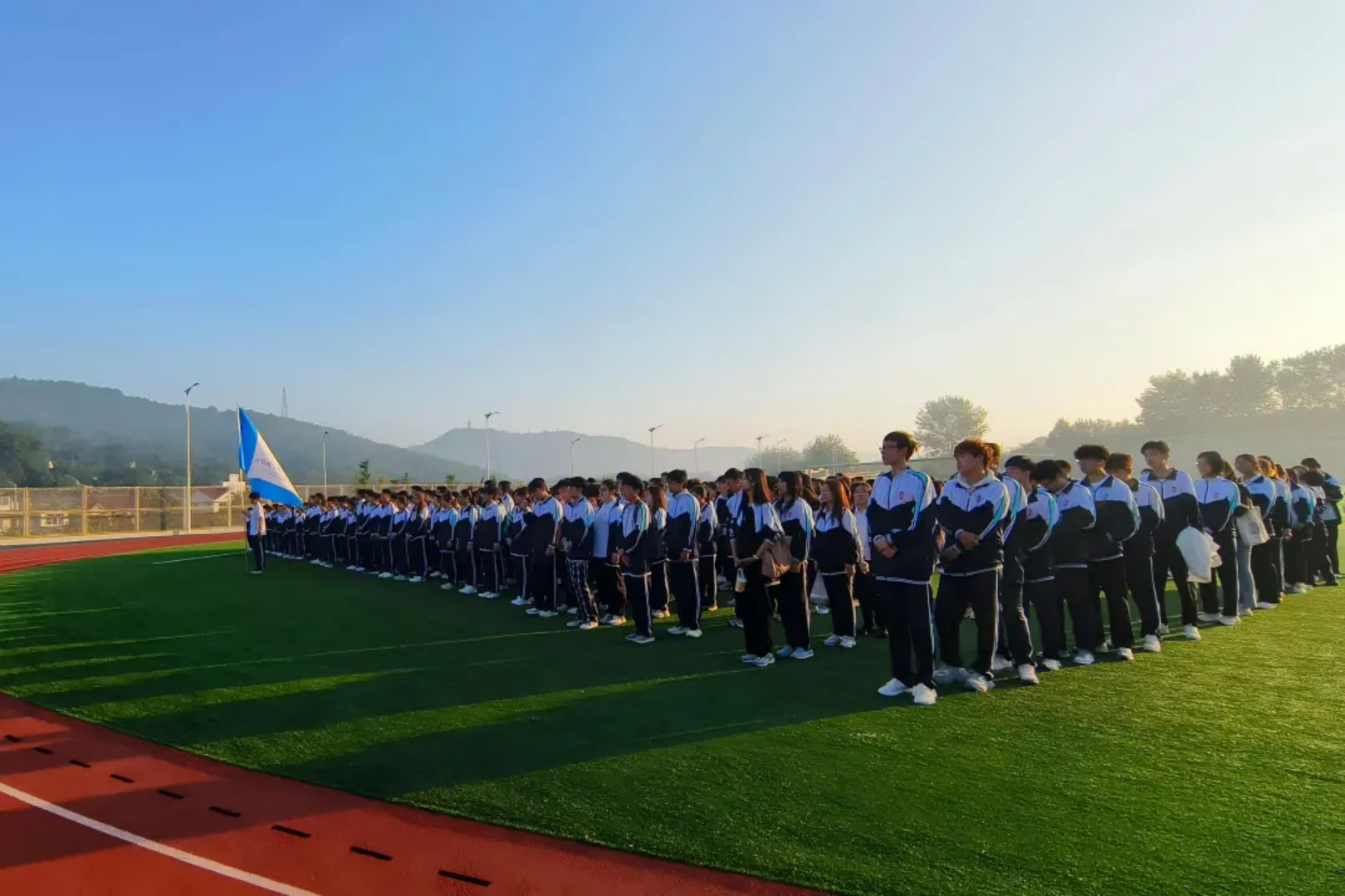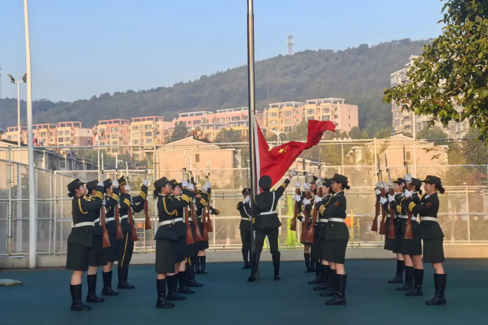 当第一缕阳光穿透薄雾,迎着东方的晨曦,国旗护卫队迈着整齐划一的步伐,他们身姿挺拔,每一步都踏出了铿锵的风采。鲜艳的五星红旗冉冉升起,在激扬的国歌声中全体师生庄严肃穆,志存高远气冲云霄,壮志凌云青春昂扬。