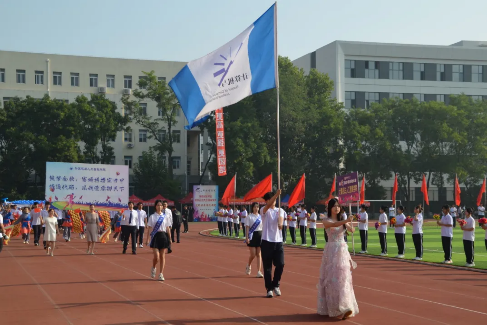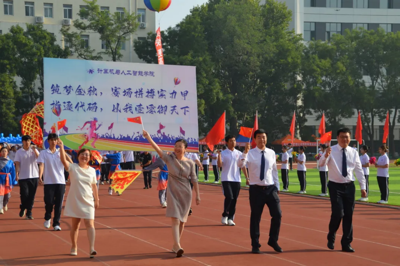晨光穿叶洒向跑道,计算机与人工智能学院代表队入场,代表队由我院领导班子、全体教师和本科生组成,他们步伐整齐、口号响亮,展现出计算机人昂扬向上的精神风貌。建院以来,我院教师始终以“忠教”“爱教”“善教”的教风夯实育人根基,计算机学子始终秉持“勤学”“乐学”“博学”的学风坚守治学初心,以实干之我、奋斗之我,筑梦新时代、建功新征程,为民族复兴伟业注入科技动能!