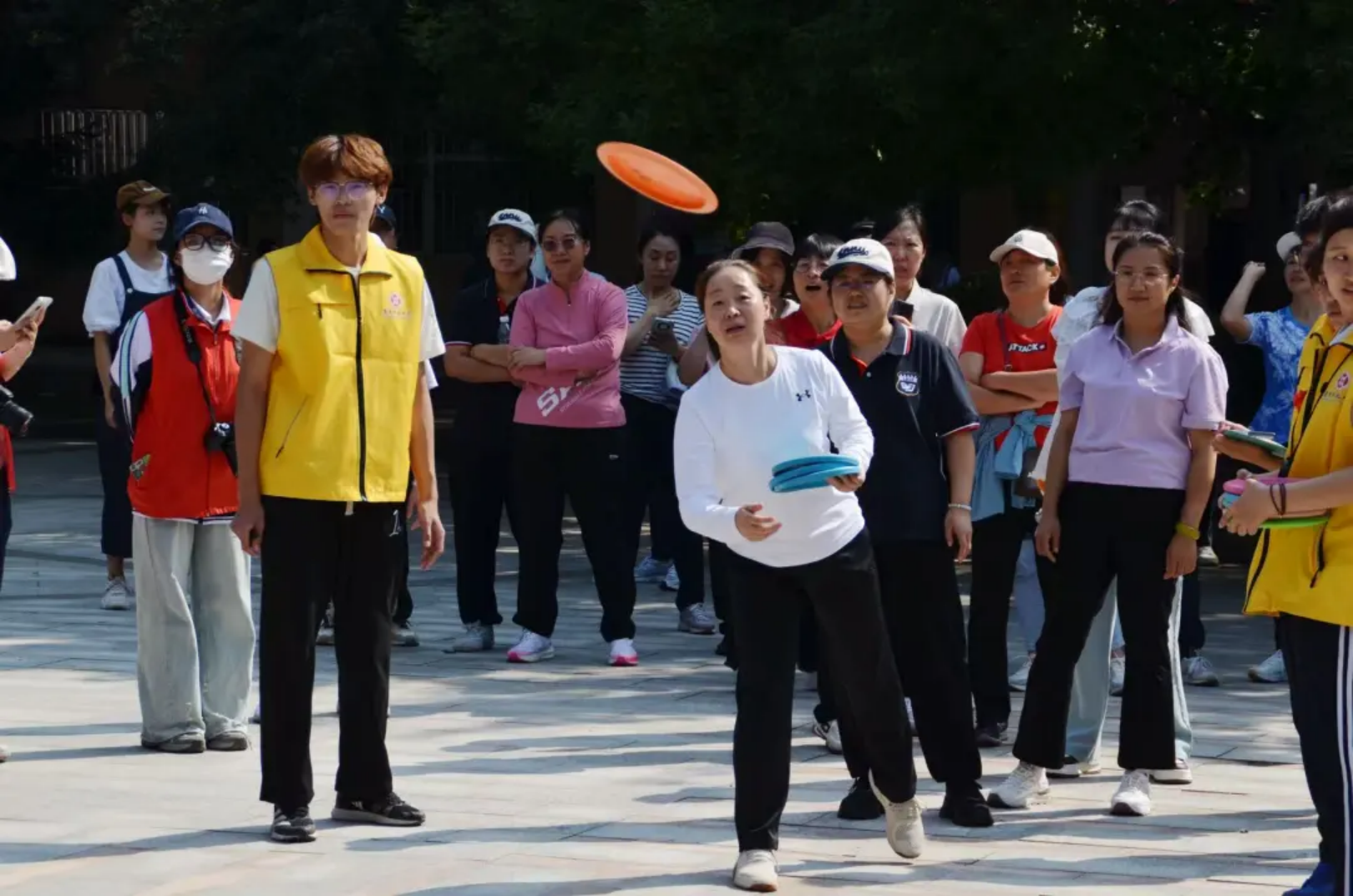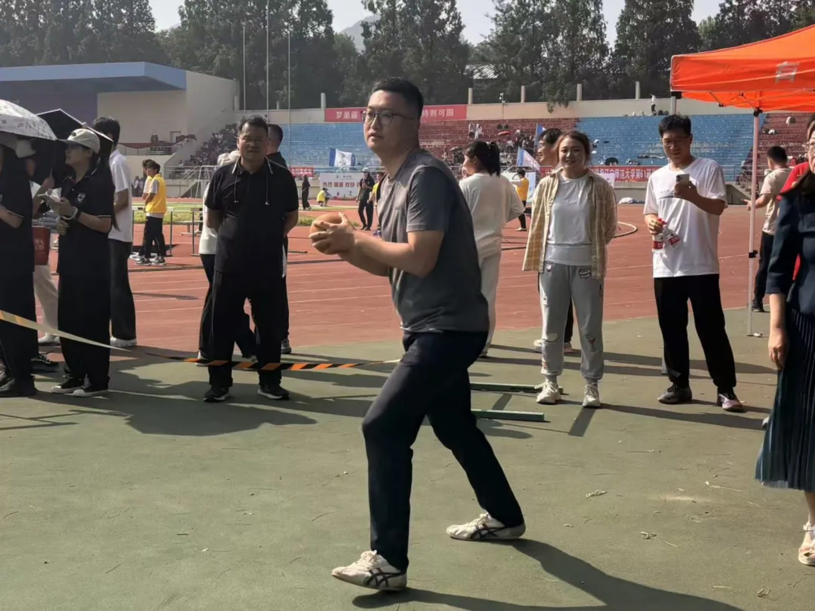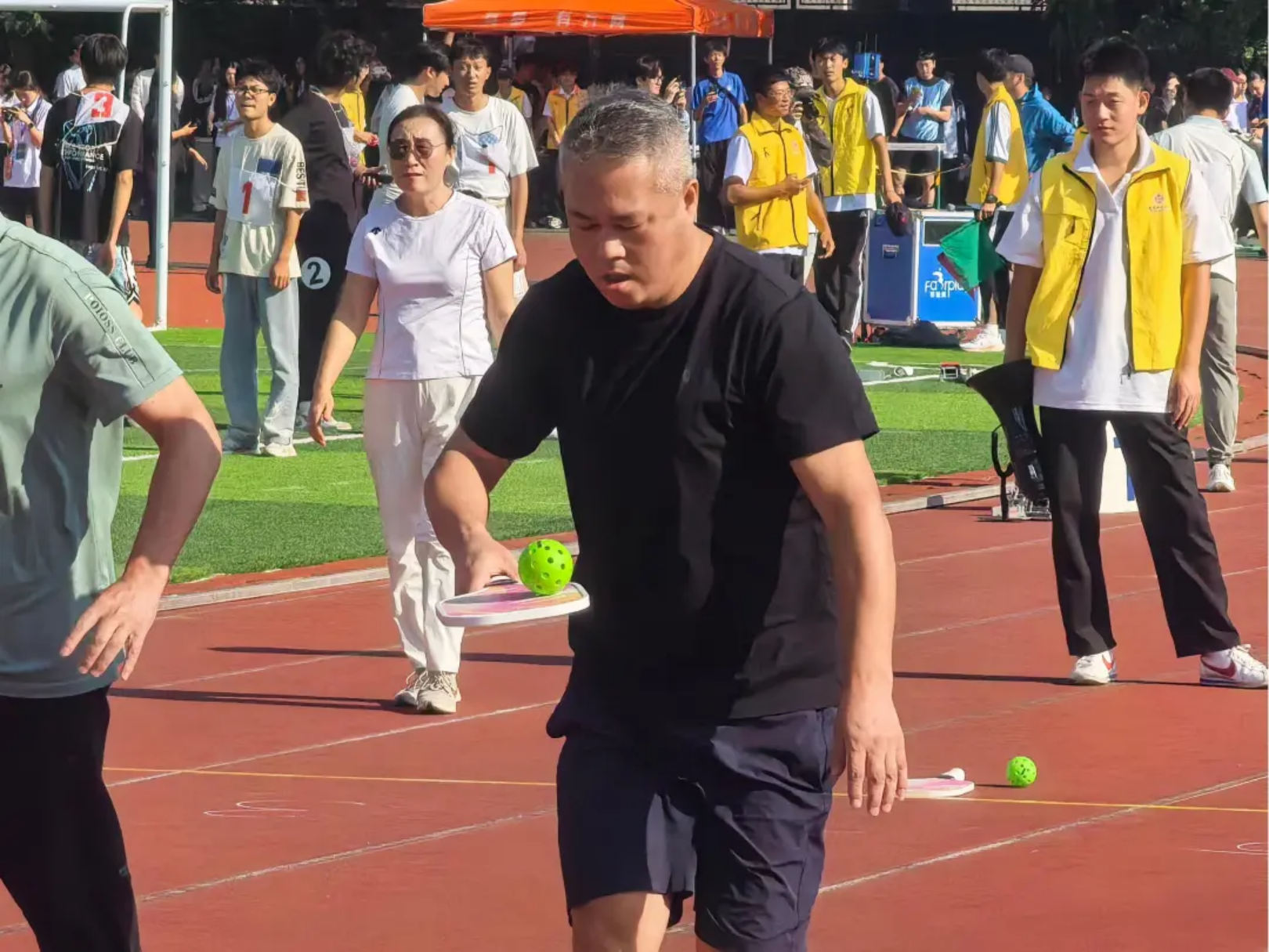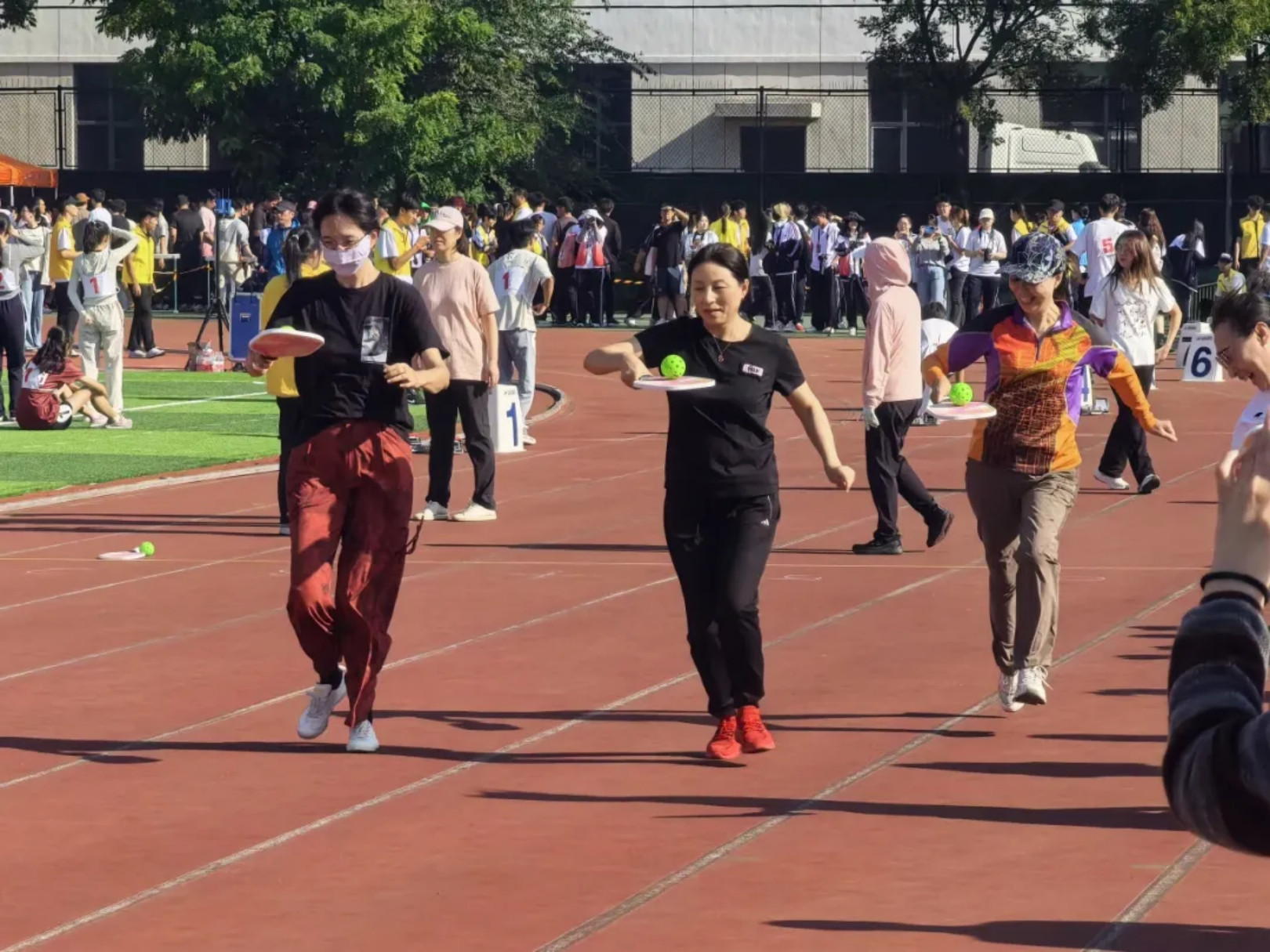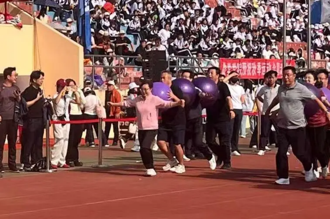 实心球划破空气,带着青春的张力落地;沙包飞向目标,载着童真的快乐弹跳;飞盘乘风盘旋,漾开勇气的潇洒弧度;足球场上,一记射门划出飒爽弧线。托球时,教工手握球拍稳稳承接,平稳的动作里藏着岁月赋予的从容。教工与学子在轻松的氛围中享受运动乐趣,力量与趣味相融,织就赛场最鲜活的图景。