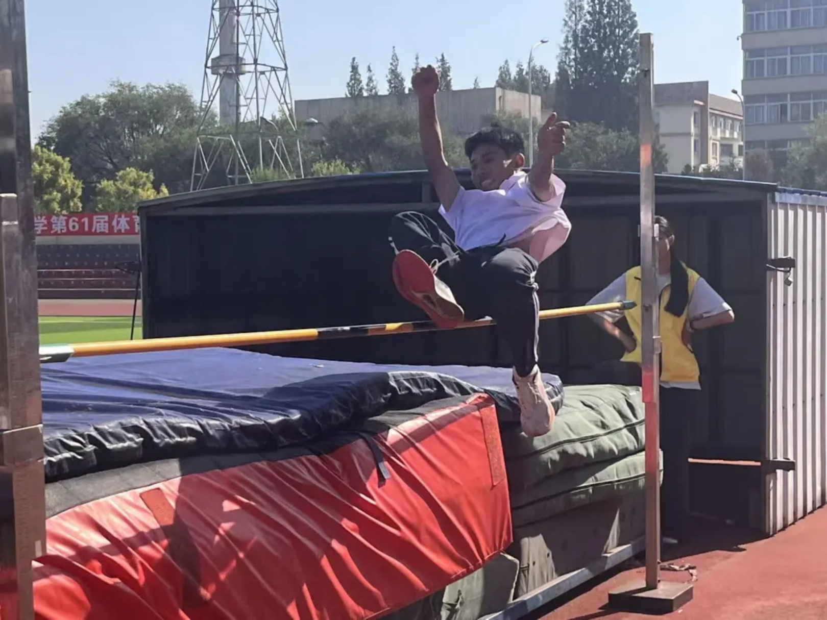 横杆在阳光下一次次升高,像在挑战极限的边界,而运动员的勇气也跟着一次次加码!助跑时脚步声渐急,屈膝、腾空,身体划出轻盈弧线。冲刺的身影中裹着“突破自我”的倔强,哪怕杆落也拍拍灰尘重新起跳。每一次向着横杆的冲刺与过杆,都是对突破极限最有力的呐喊!