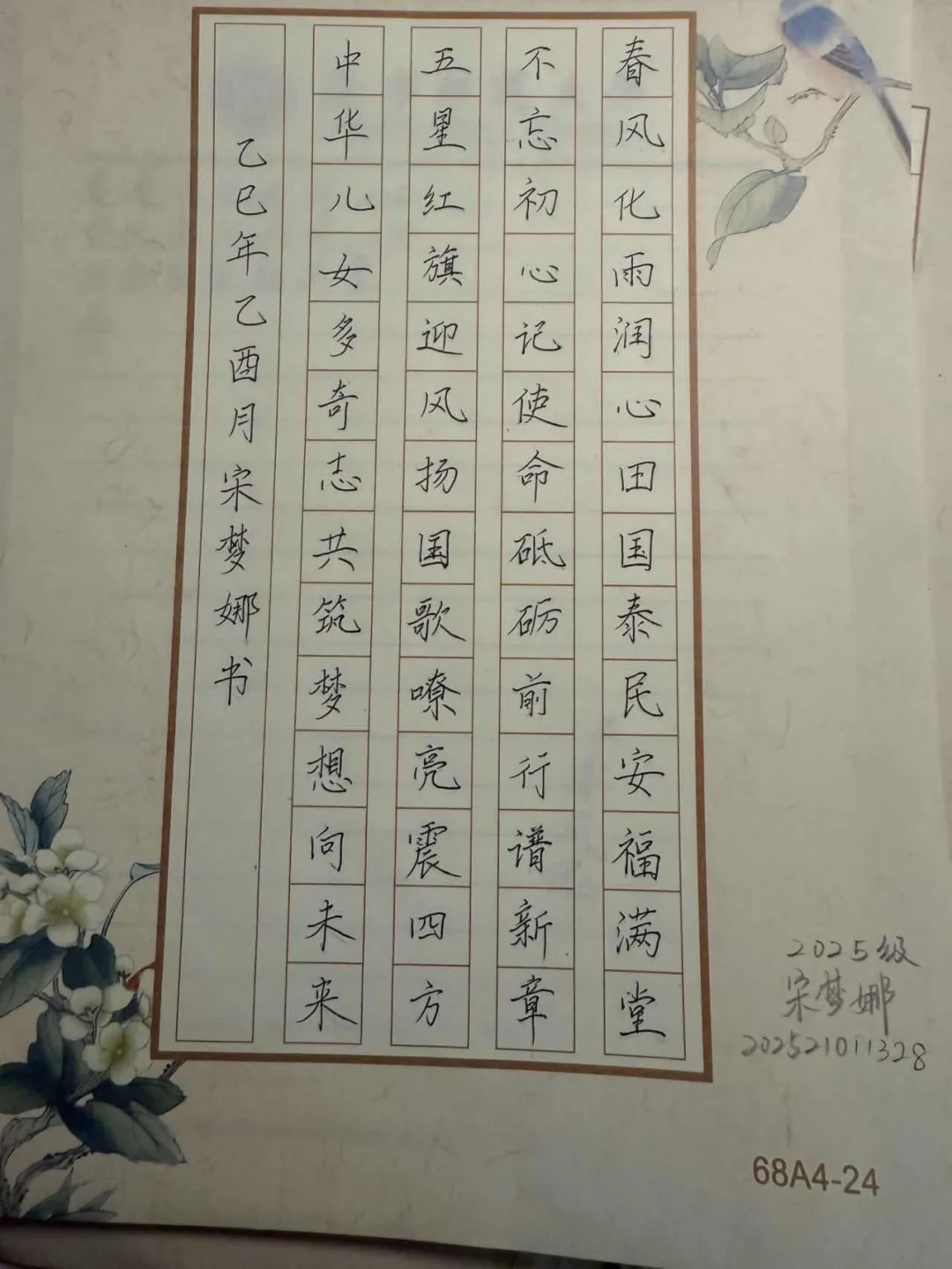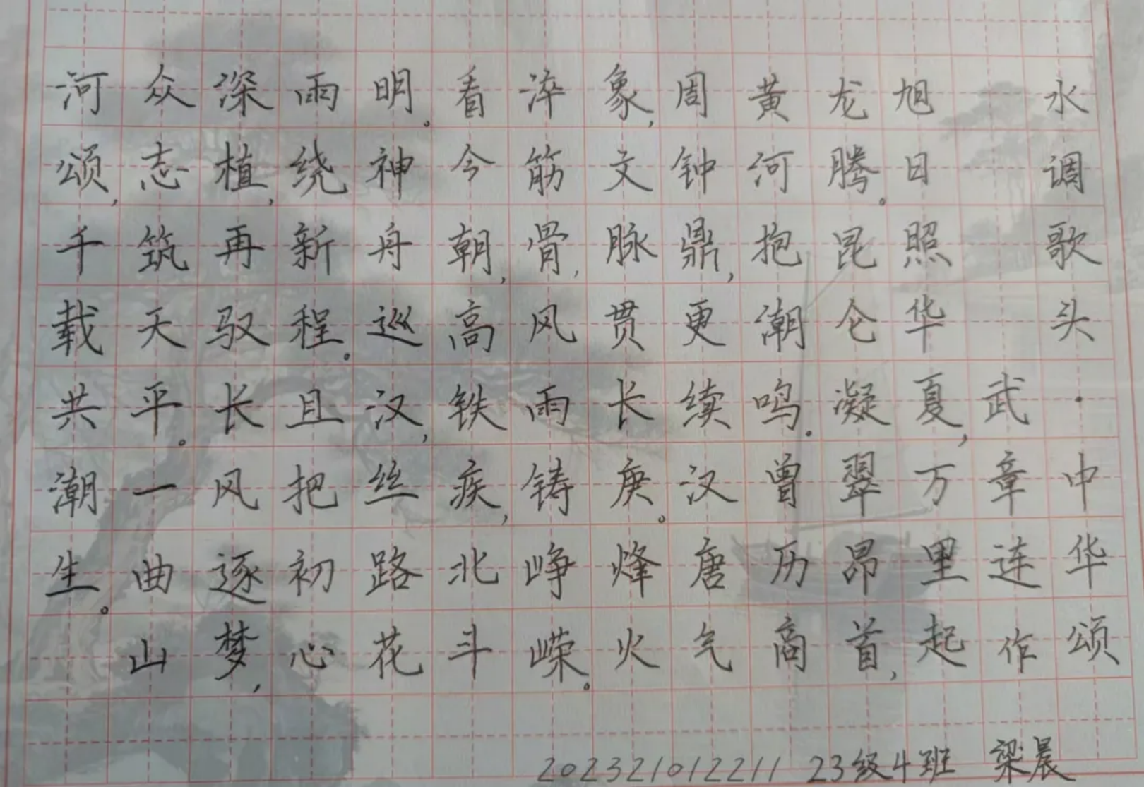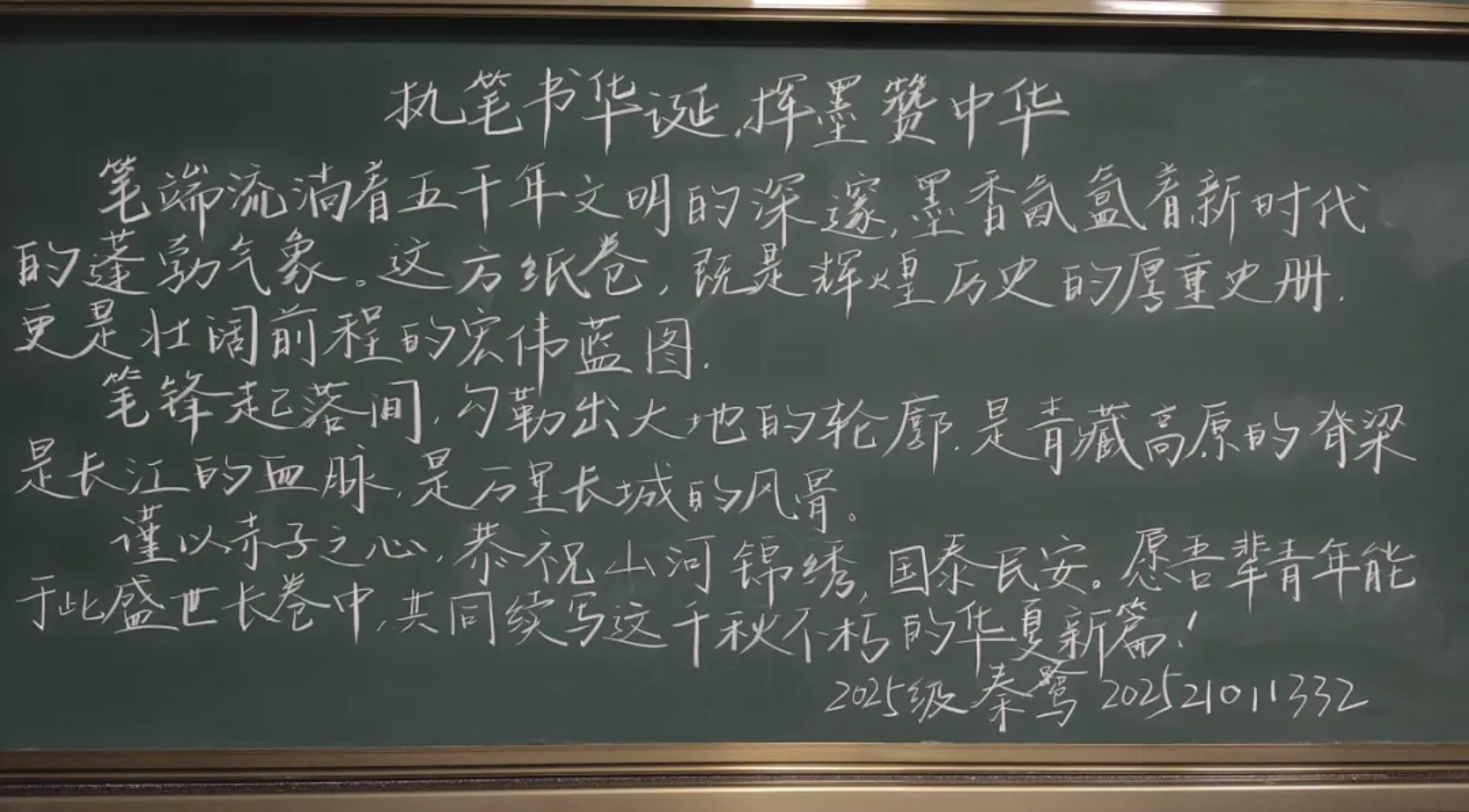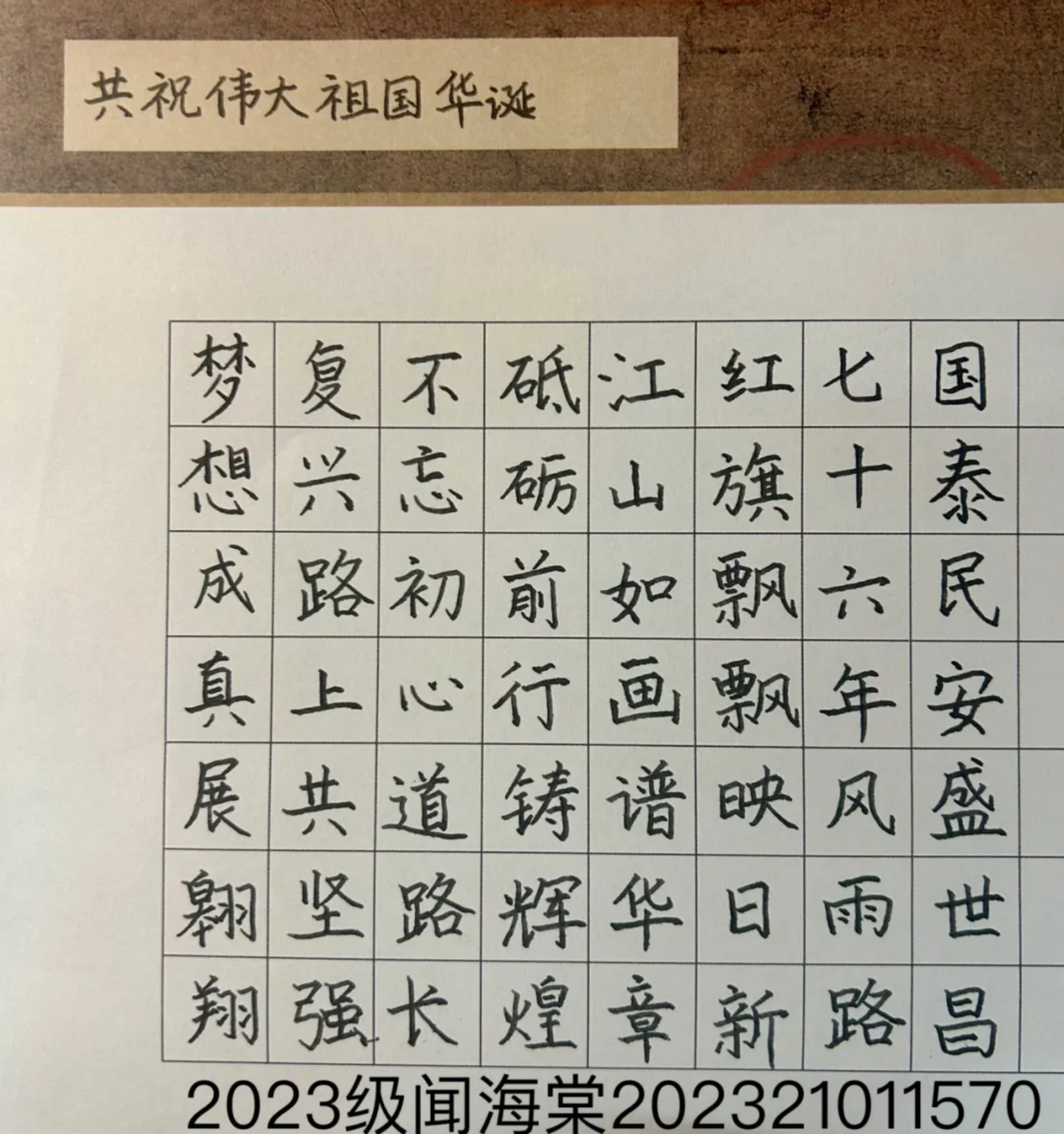 五星红旗漫卷秋风,家国情怀浸润笔墨。为了热烈庆祝中华人民共和国成立76周年,全面提高我院学子书写水平,厚植文化自信,计算机与人工智能学院成功举办“执笔书华诞,挥墨赞中华”三笔字大赛。本次大赛分为钢笔字、毛笔字和粉笔字三个赛道,经过明德教师教育协会成员的筛选,最终评选出如下获奖作品,接下来让我们共同欣赏一下!
