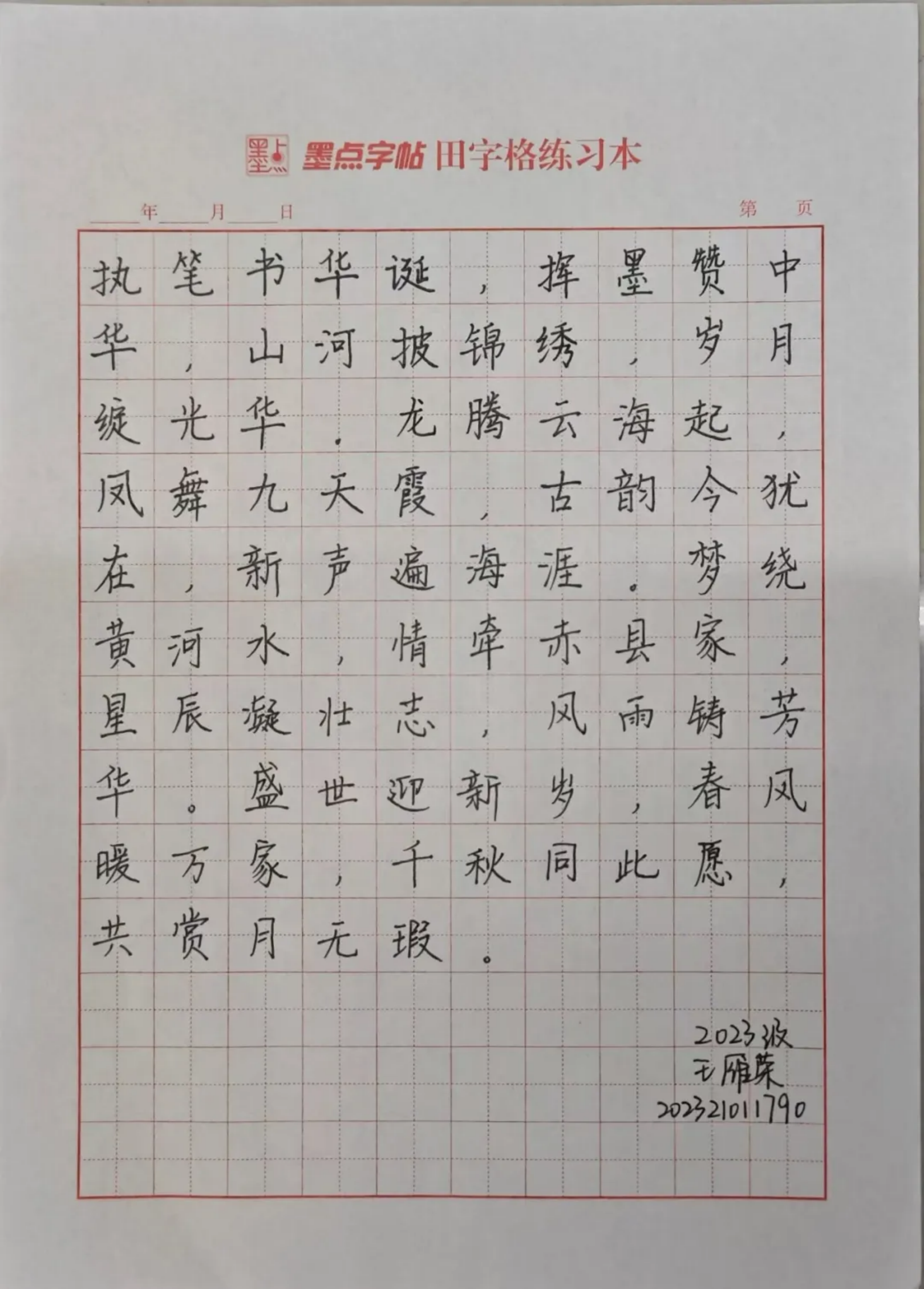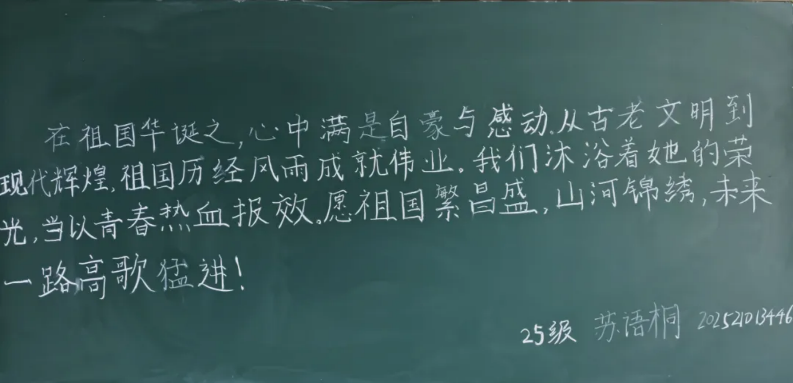 至此,“执笔书华诞,挥墨赞中华”三笔字大赛圆满落下帷幕。愿我院学子们能将笔墨间的专注与严谨融入专业学习,以谦逊之心笃行不怠;更愿大家将对祖国的赤诚、对理想的坚守刻入血脉,既以代码筑就科技之基,也以热爱传递文化之韵,奔赴祖国发展的壮阔征程,书写属于自己的青春华章,在数字时代与文化传承的交汇处,绽放更耀眼的光芒!