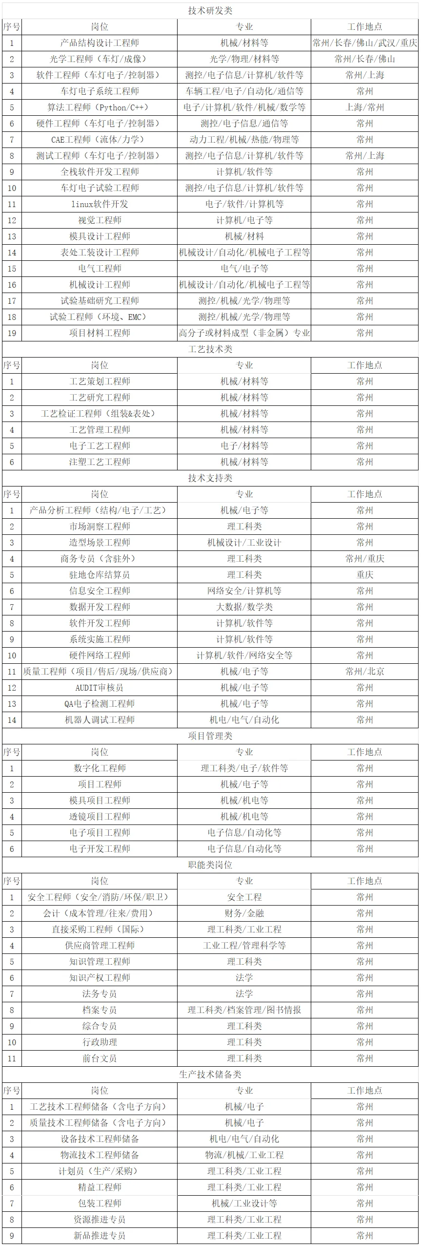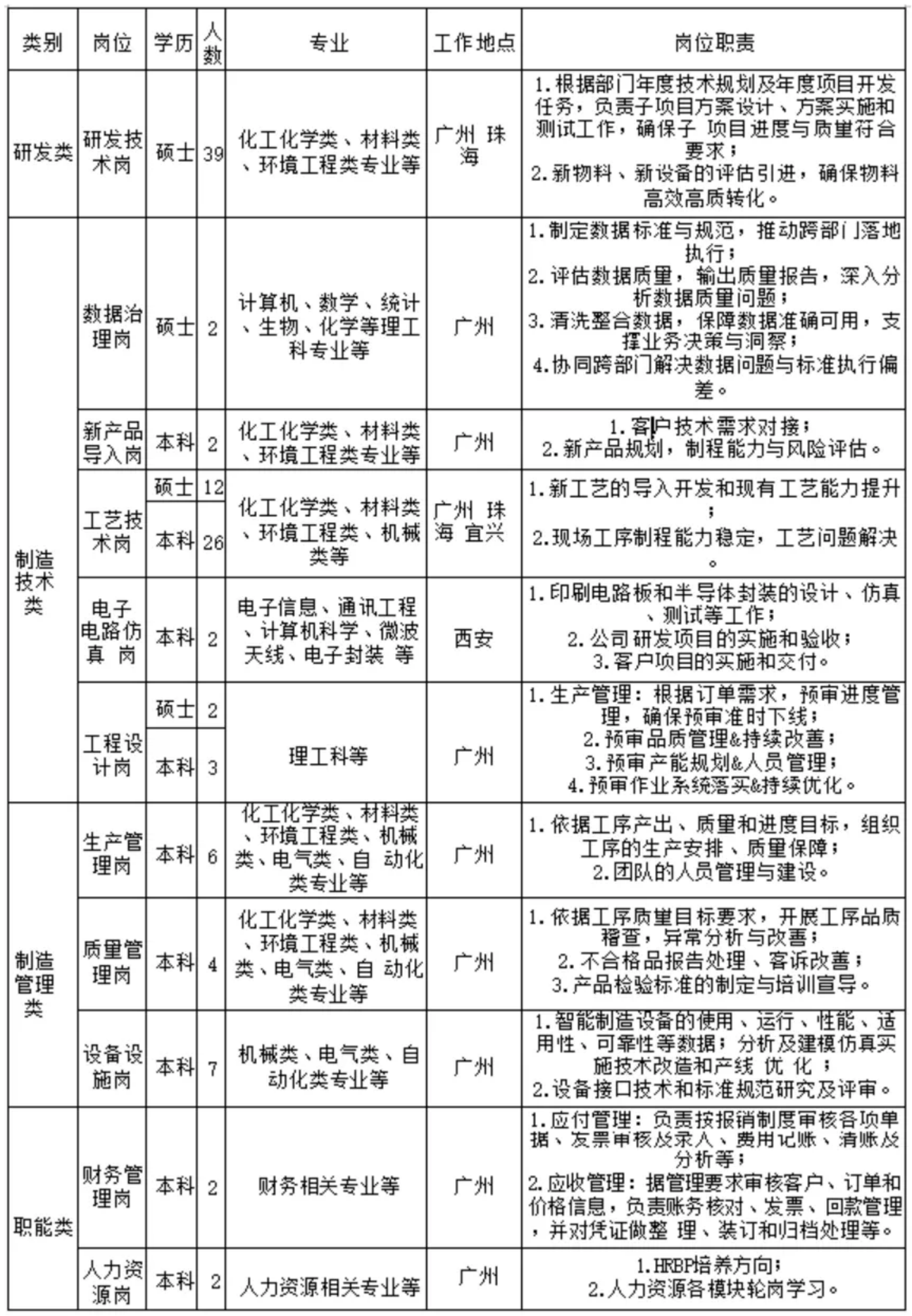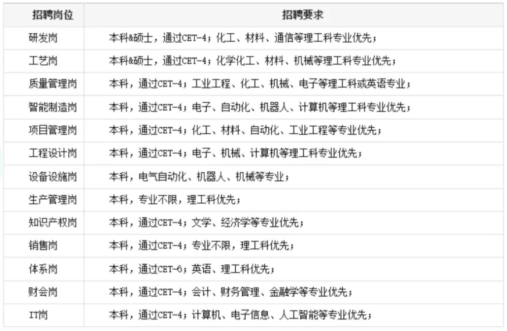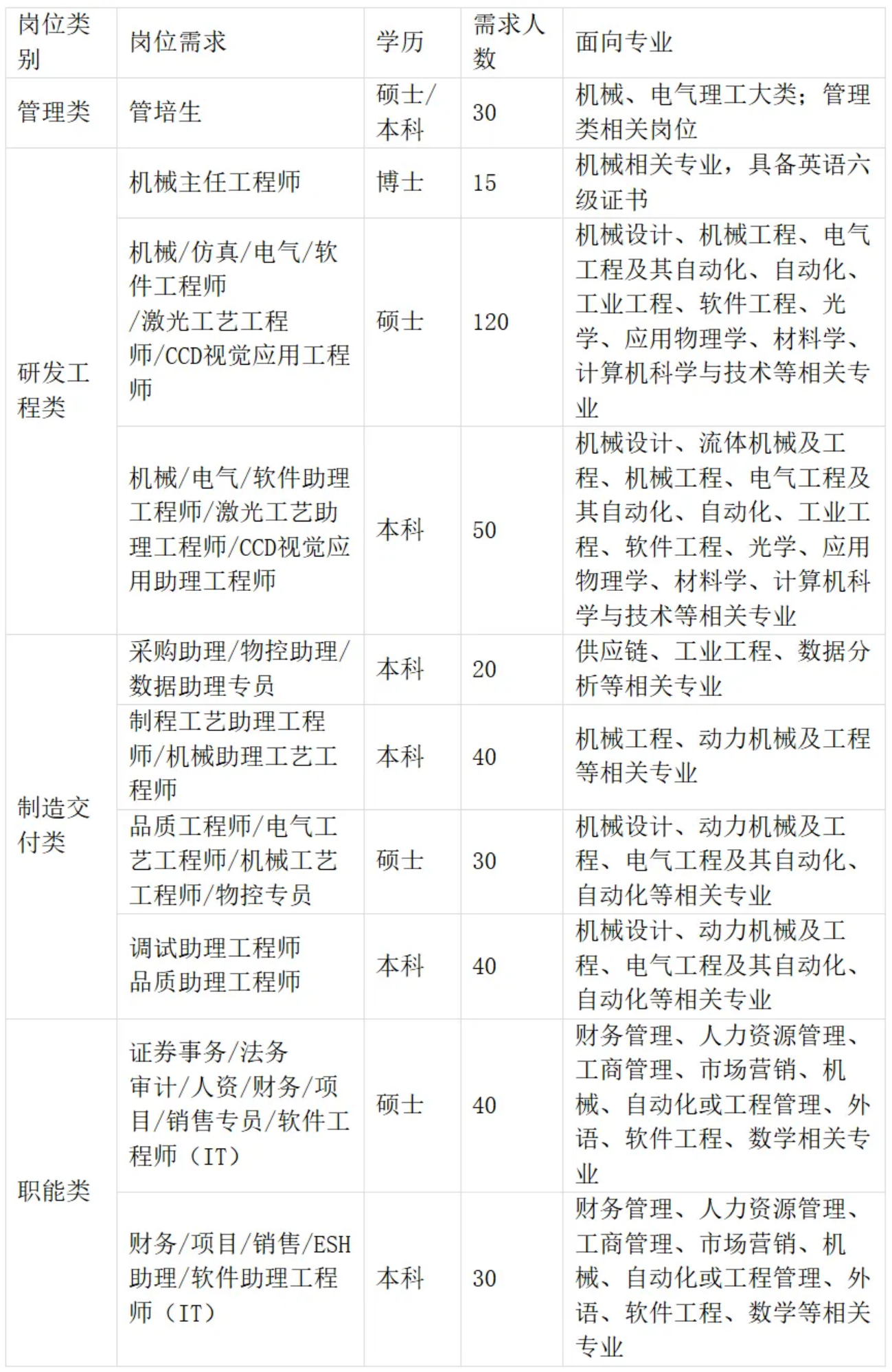 (1)岗位:材料工艺、智能装备、电气工程师、设备工程师、生产管培、人工智能研发、产业信息化研发等