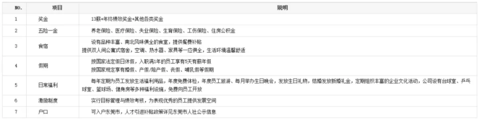 顶尖的工作环境,具有竞争力的薪酬、五险一金、带薪假期、提供食宿/餐补、花园式工厂、员工俱乐部、其他福利